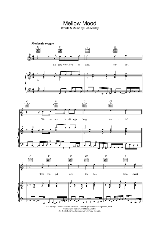 Digital Sheet Music for Mellow Mood by Bob Marley scored for Piano/Vocal/Chords; id:392101