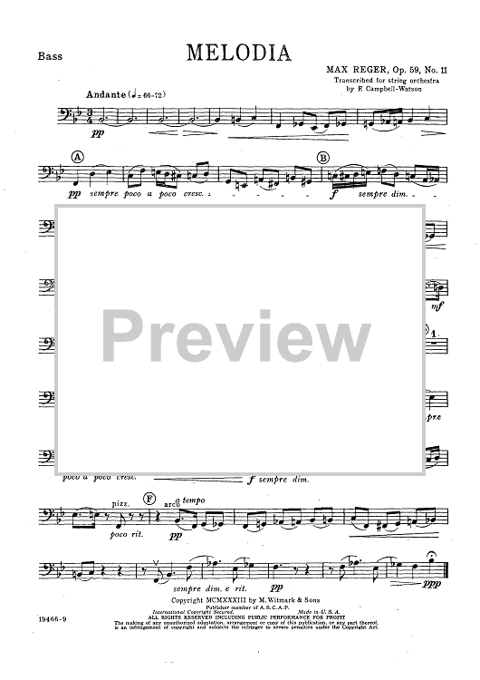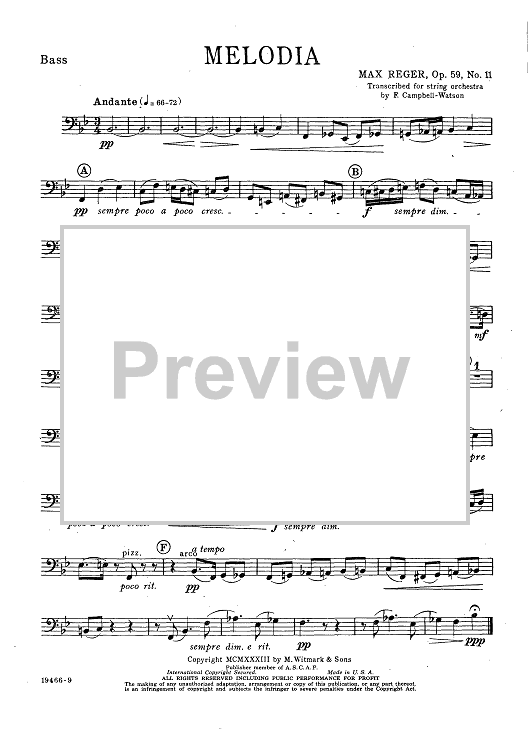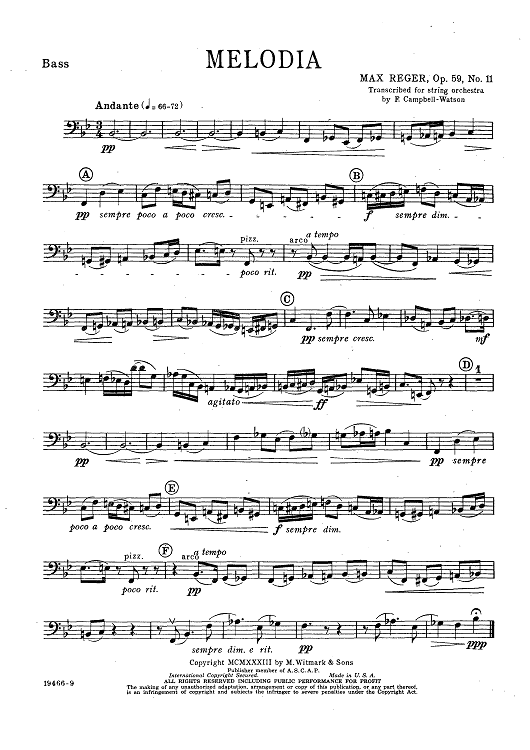Digital Sheet Music for Melodia Op. 59, No. 11 - Bass by , Max Reger, F. Campbell-Watson scored for String Orchestra; id:423771