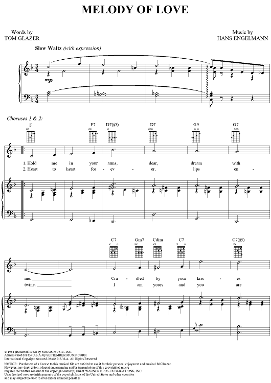 Digital Sheet Music for Melody Of Love by Hans Engelmann, Tom Glazer scored for Piano/Vocal/Chords; id:241654