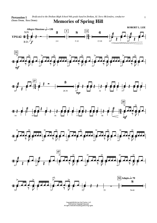 Digital Sheet Music for Memories of Spring Hill - Percussion 1 by Robert L. Lee scored for Concert Band; id:453730