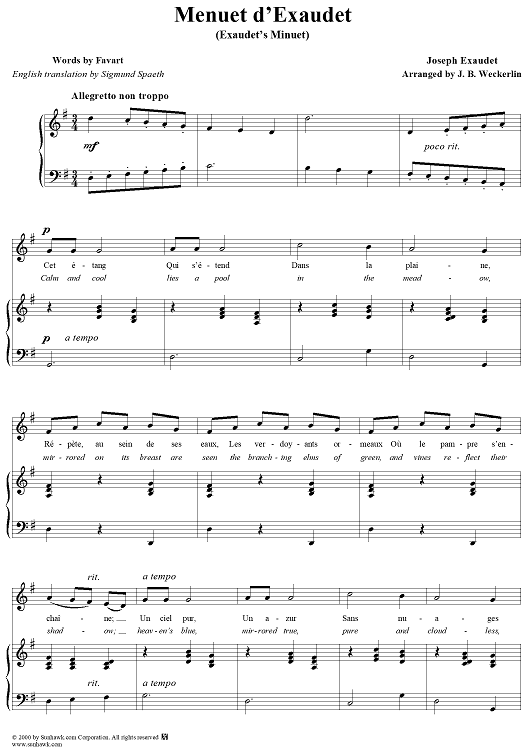 Digital Sheet Music for Menuet d'Exaudet - (Exaudet's Minuet) by Joseph Exaudet, Favart, J. B. Weckerlin scored for Voice/Piano; id:270440