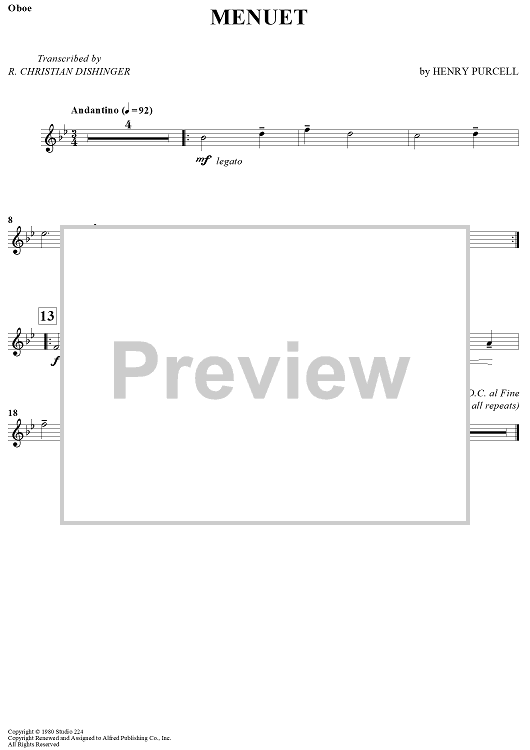 Digital Sheet Music for Menuet by Henry Purcell, R. Christian Dishinger scored for Oboe/Piano; id:438122