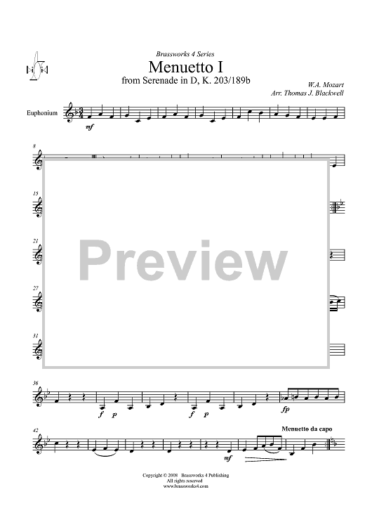 Digital Sheet Music for Menuetto I - Euphonium by Wolfgang Amadeus Mozart, Thomas J. Blackwell scored for Brass Quartet; id:410543