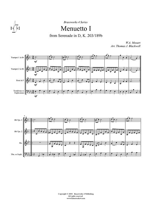 Digital Sheet Music for Menuetto I - Score by Wolfgang Amadeus Mozart, Thomas J. Blackwell scored for Brass Quartet; id:410538