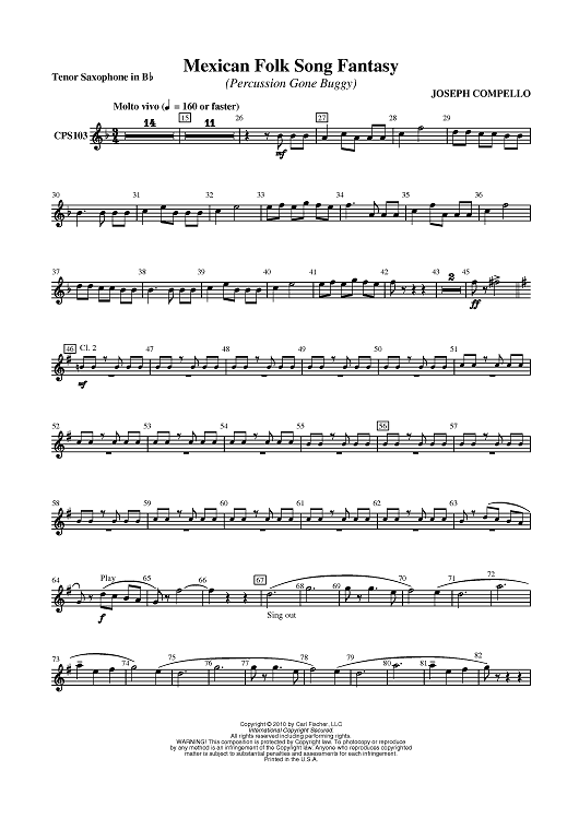 "Mexican Folk Song Fantasy (Percussion Gone Buggy) - Tenor Sax" Sheet Music by Joseph Compello