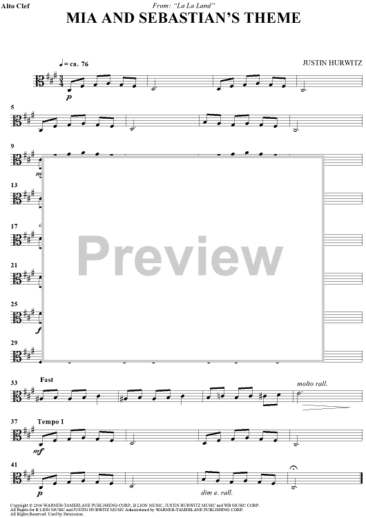 "Mia and Sebastian's Theme - from La La Land - Alto Clef Instruments" Sheet Music by Justin Hurwitz