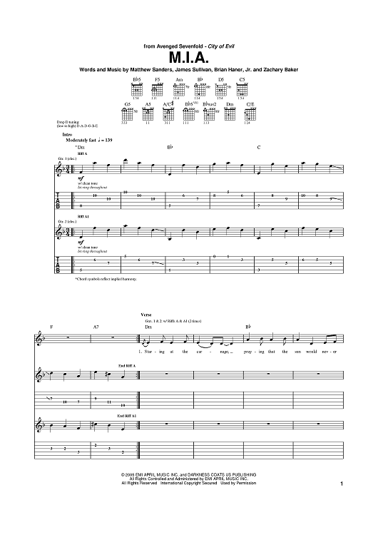 Digital Sheet Music for M.I.A. by Avenged Sevenfold, Zachary Baker, Jr., Brian Haner, Matthew Sanders, James Sullivan scored for Guitar Tab; id:388758