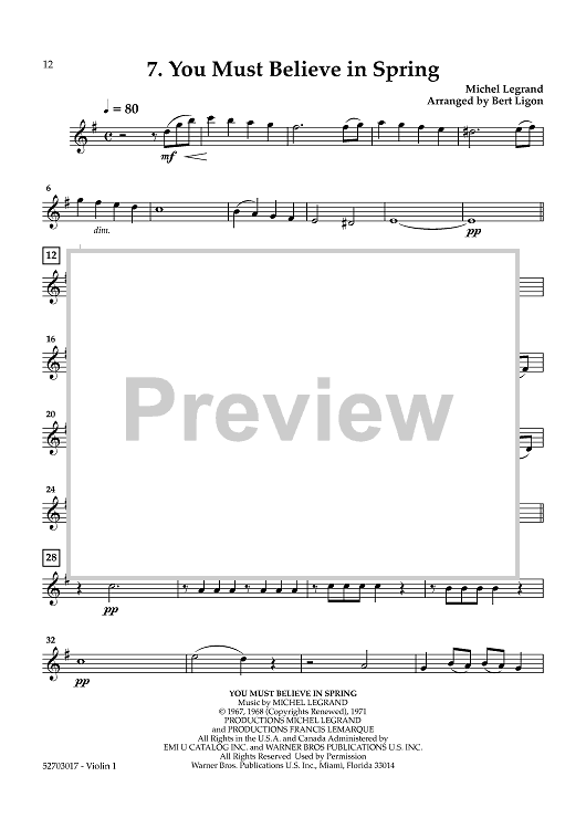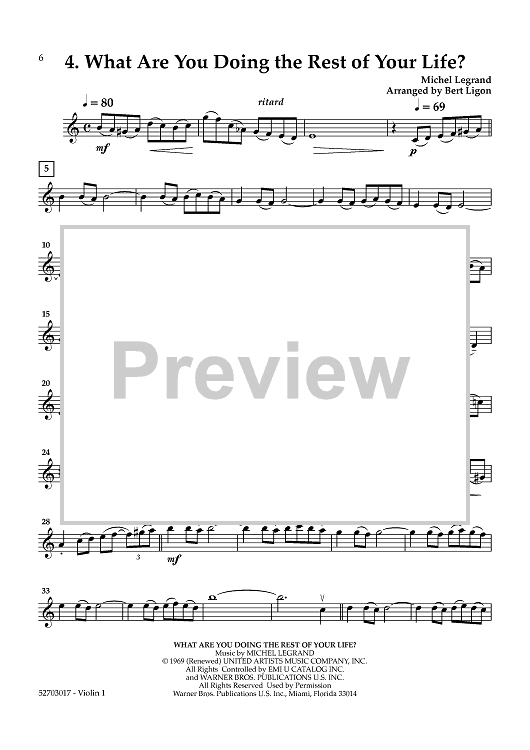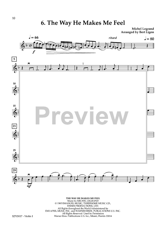 Digital Sheet Music for Michel Legrand Album - Violin 1 by Michel LeGrand, Bert Ligon scored for String Quartet; id:458197