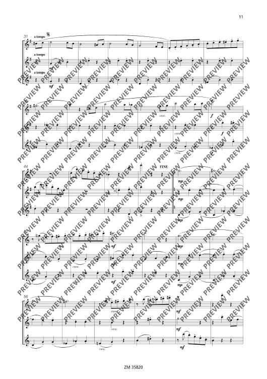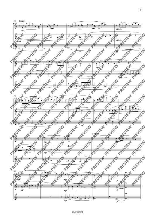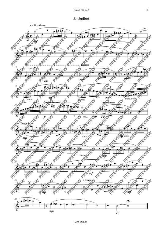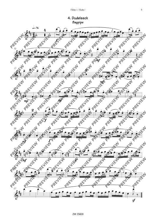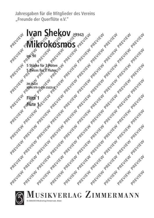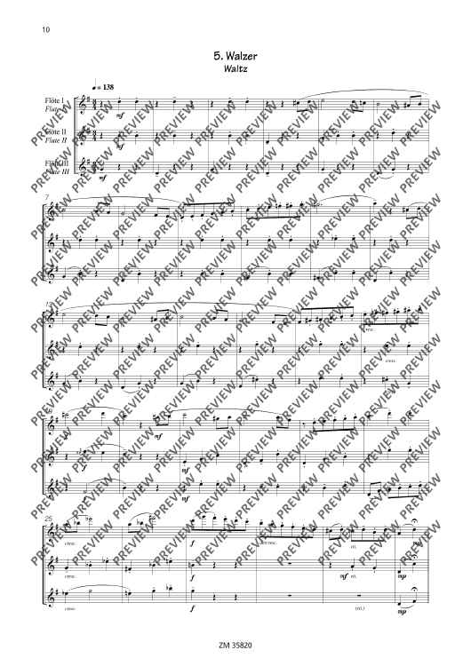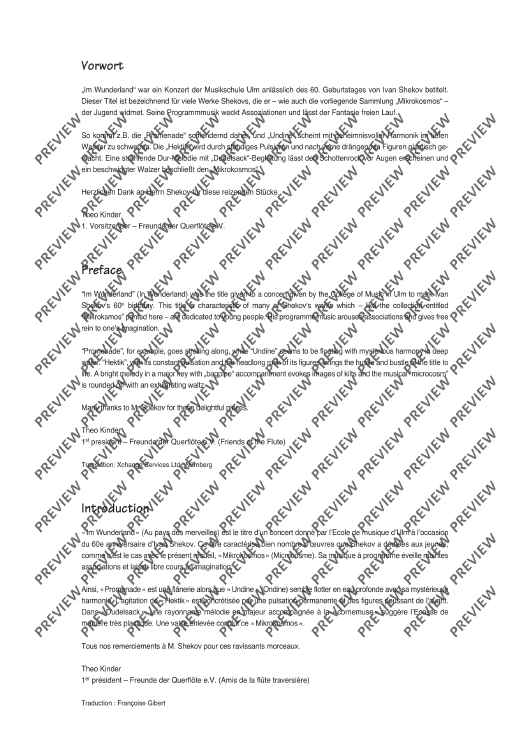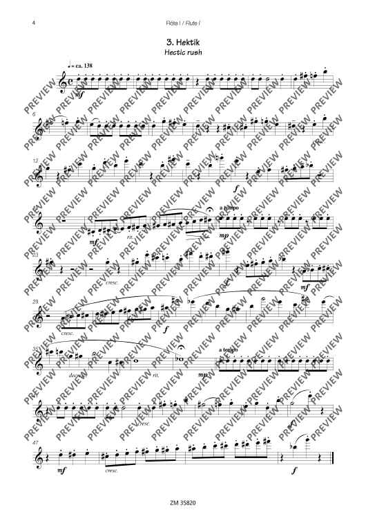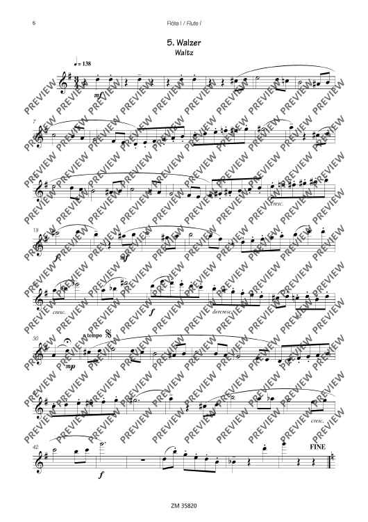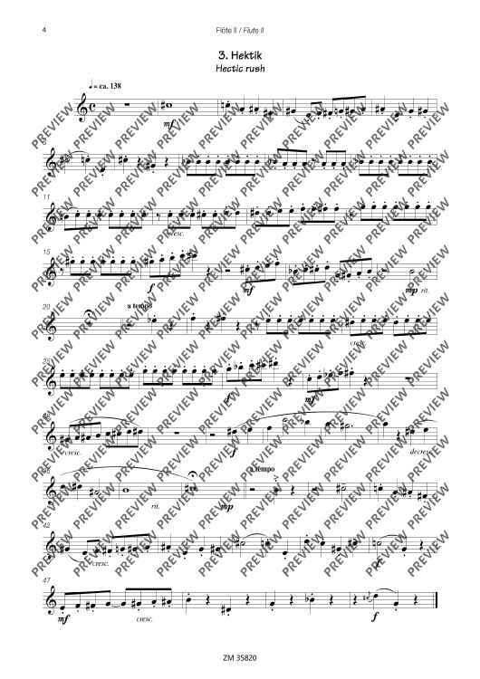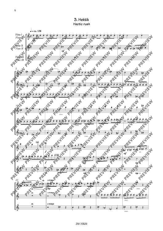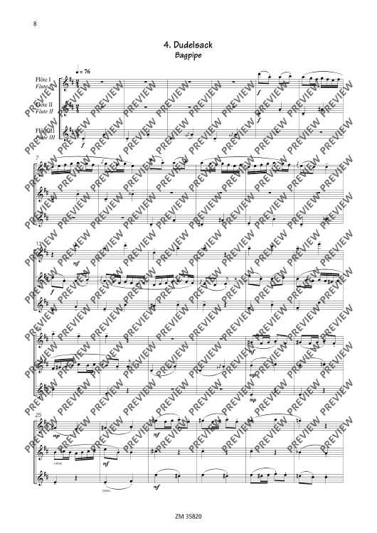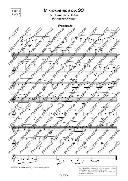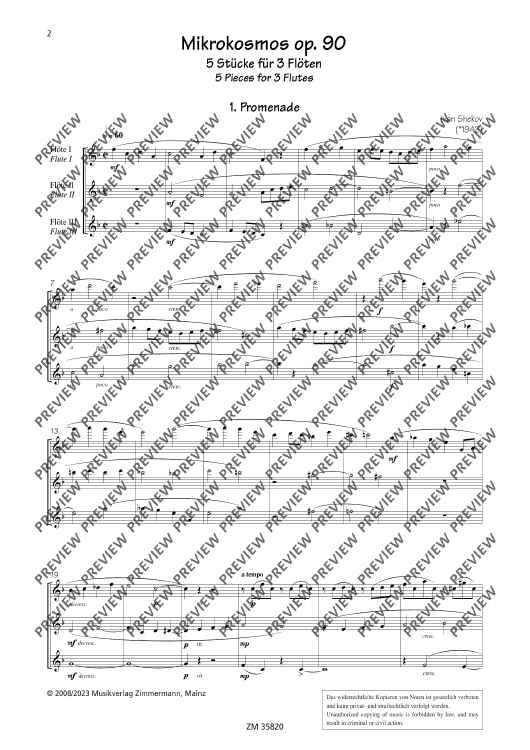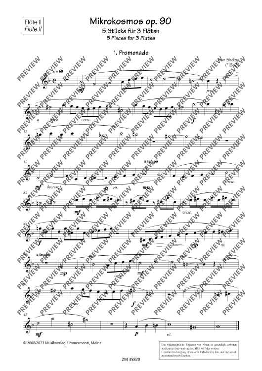 The collection Mikrokosmos includes five varying pieces, which generate associations and lets imagination run free. A bright major-melody with "bagpipe" accompaniment gives you the idea of a kilt and a lilt waltz determins the "Mikrokosmos". The pieces are of average skill and an enrichment of the repertoire for 3 flutes.