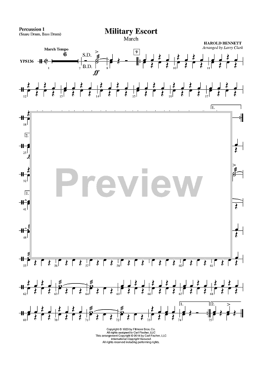 Digital Sheet Music for Military Escort March - Percussion 1 by Larry Clark, Harold Bennett scored for Concert Band; id:452690