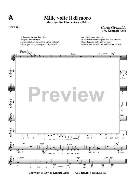 Digital Sheet Music for Mille volte il di moro - Horn in F by , Carlo Gesualdo, Kenneth Amis scored for Woodwind Quintet; id:365554