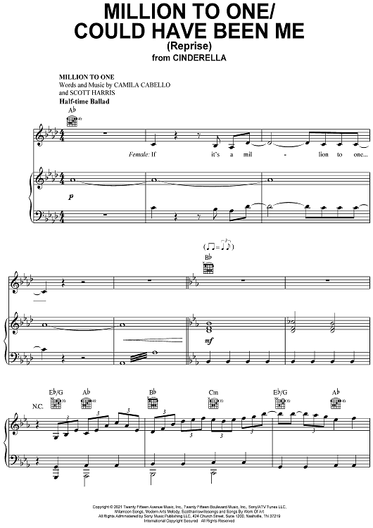 Digital Sheet Music for Million To One/Could Have Been Me (from the Amazon Original Movie Cinderella) by Scott Harris, Camila Cabello, Nicholas Galitzine scored for Piano/Vocal/Chords; id:469733