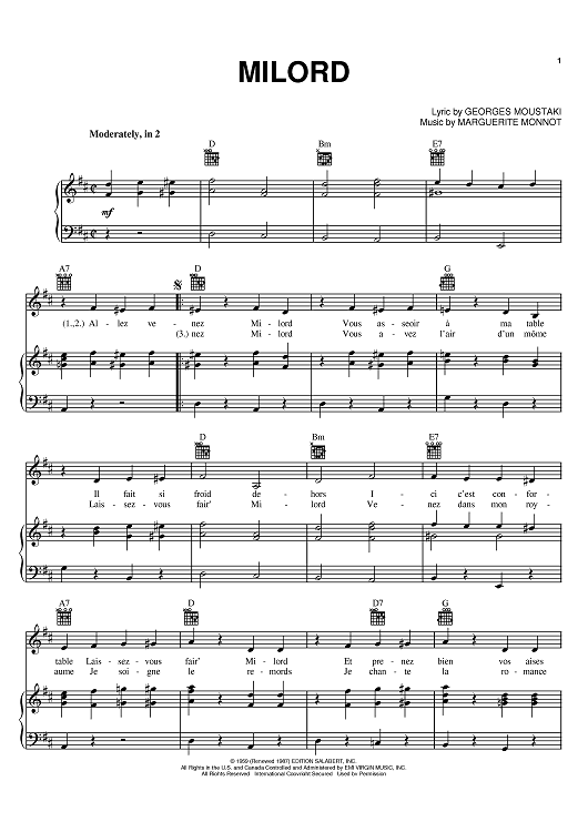 Digital Sheet Music for Milord by Edith Piaf, Marguerite Monnot, Goerges Moustaki scored for Piano/Vocal/Chords; id:395207