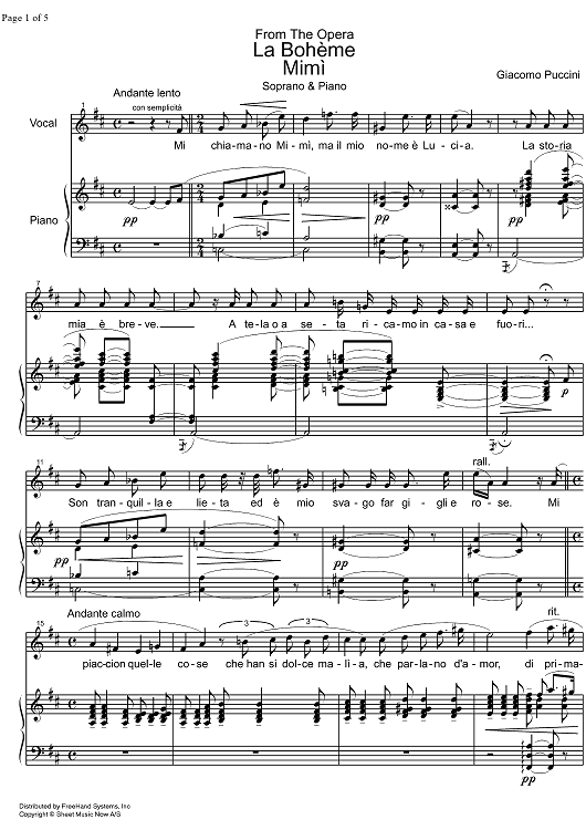 Digital Sheet Music for Mimi Aria from La Bohème by Giacomo Puccini, SMN Archive Collection scored for Soprano/Piano; id:323892