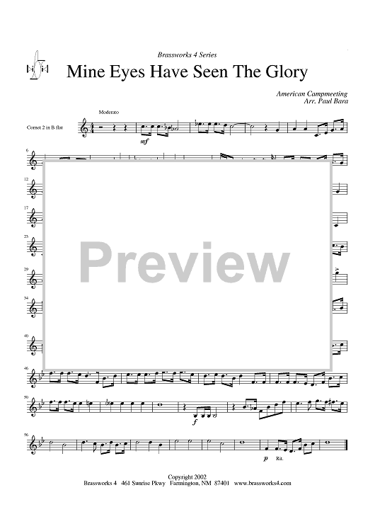 Digital Sheet Music for Mine Eyes Have Seen the Glory - Cornet 2/Trumpet 2 by Paul Bara, American Campmeeting scored for Brass Quartet; id:316922
