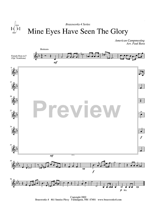 Digital Sheet Music for Mine Eyes Have Seen the Glory - Horn in F by Paul Bara, American Campmeeting scored for Brass Quartet; id:316924