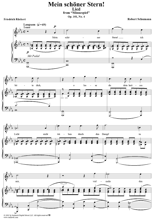 Digital Sheet Music for Minnespiel, Op. 101, No. 4: Lied - Mein schöner Stern! by Friedrich Rückert, Robert Schumann scored for Voice/Piano; id:258231
