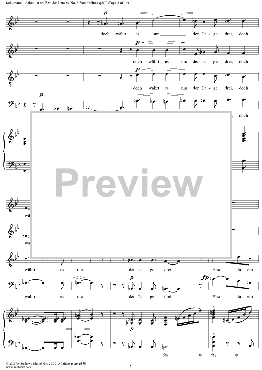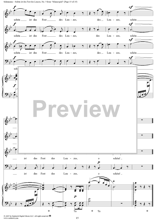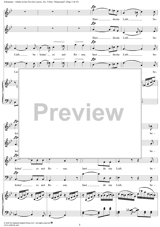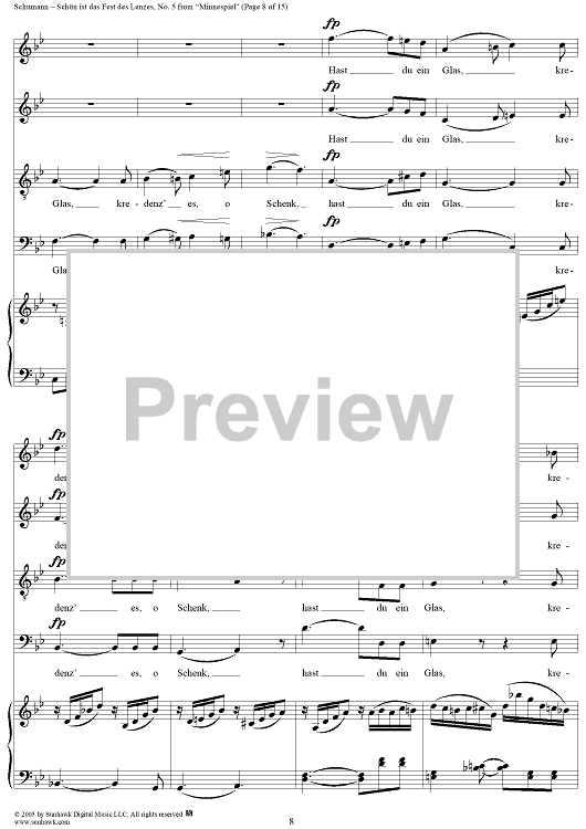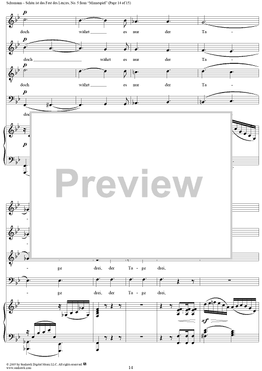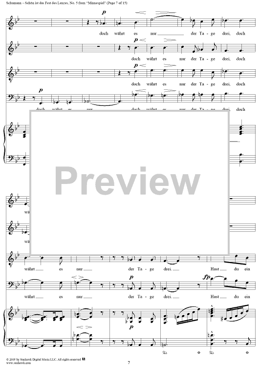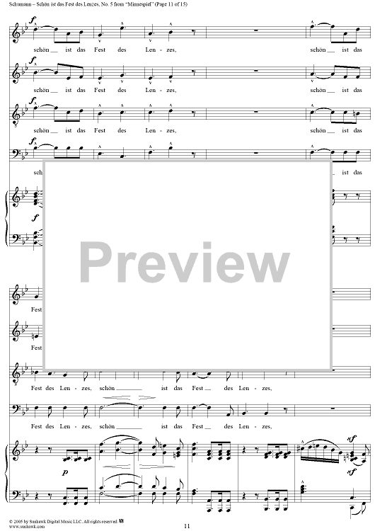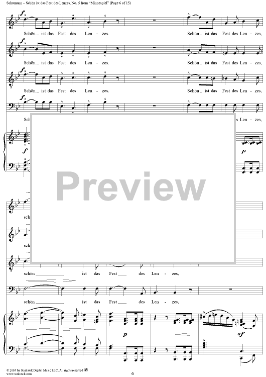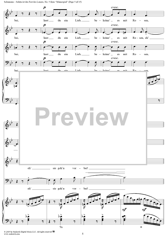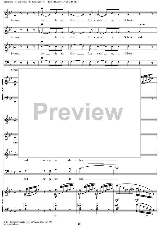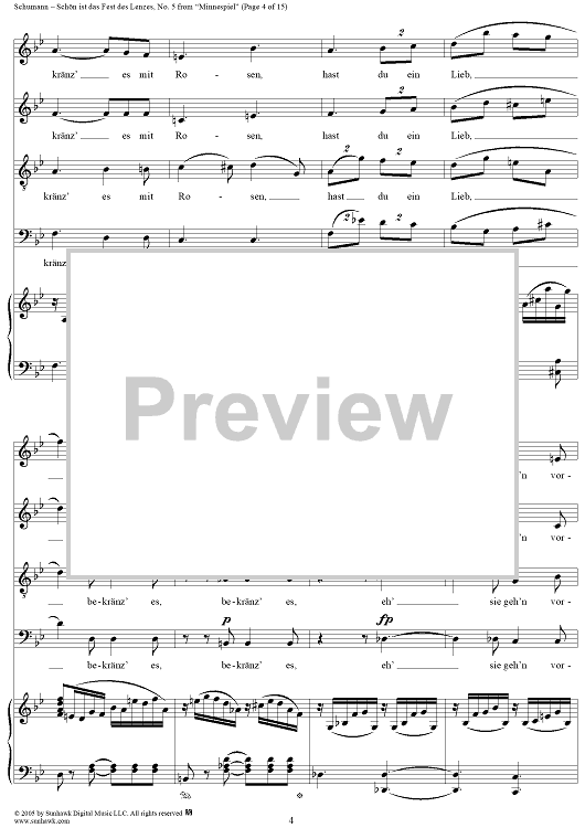 Digital Sheet Music for Minnespiel, Op. 101: No. 5, Quartett "Schön ist das Fest des Lenzes" by Friedrich Rückert, Robert Schumann scored for Voice/Piano; id:306939