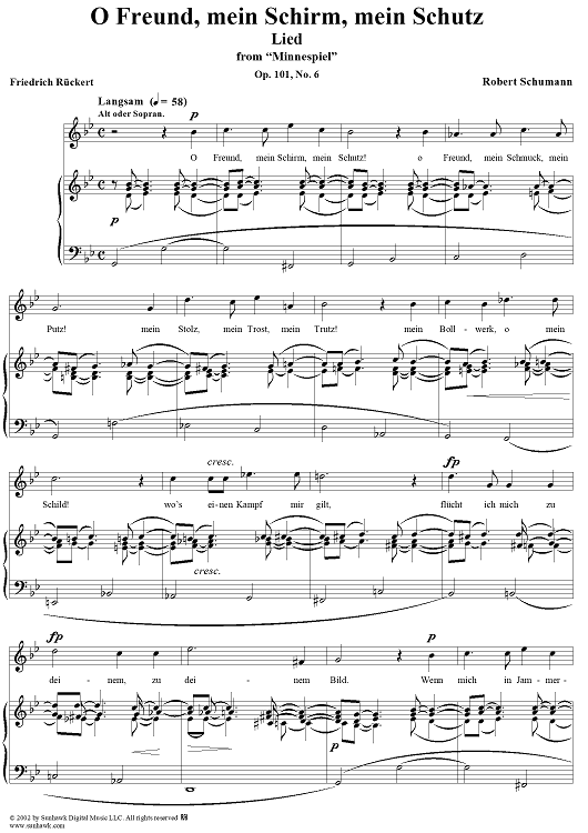 Digital Sheet Music for Minnespiel, Op. 101, No. 6: Lied - O Freund, mein Schirm, mein Schutz by Friedrich Rückert, Robert Schumann scored for Voice/Piano; id:258225