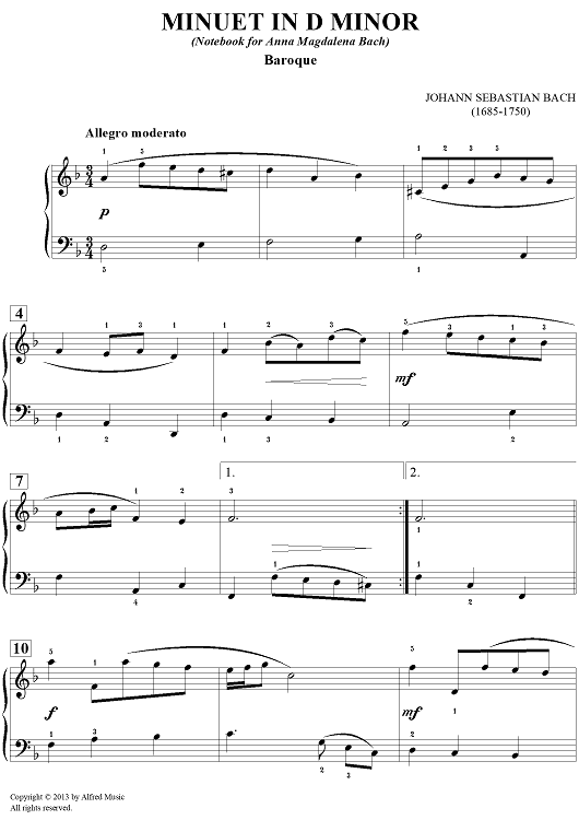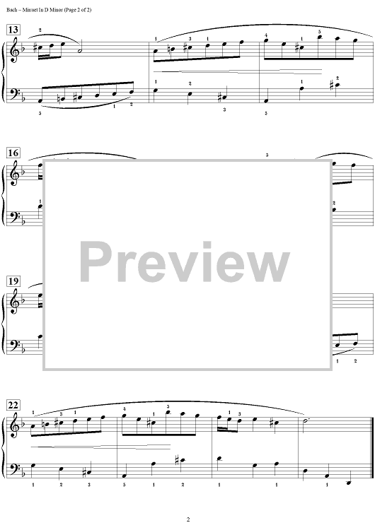 Digital Sheet Music for Minuet In D Minor (Baroque) by Johann Sebastian Bach, Melody Bober scored for Piano; id:463263