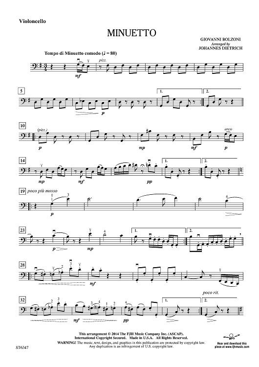 Digital Sheet Music for Minuetto - Violoncello by Giovanni Bolzoni, Johannes Dietrich scored for Orchestra; id:448158