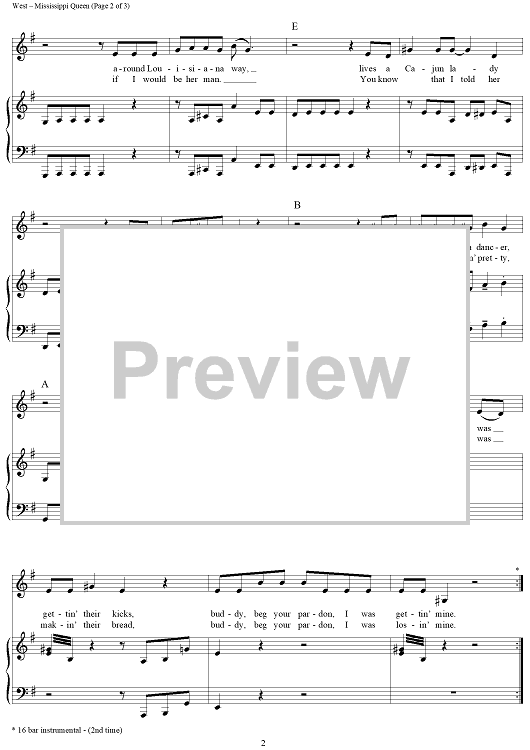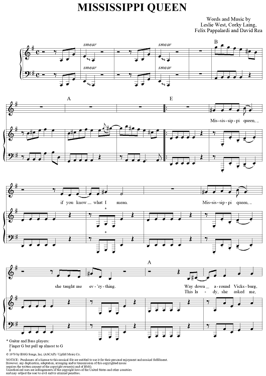 Digital Sheet Music for Mississippi Queen by Felix Pappalardi, Leslie West, Corky Laing, David Rea, Mountain scored for Piano/Vocal/Chords; id:321586