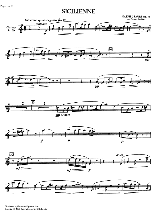 Digital Sheet Music for Moderate 1/1 - Sicilienne Op.78 - Clarinet by Gabriel Fauré, James Walker scored for Clarinet/Piano; id:332730