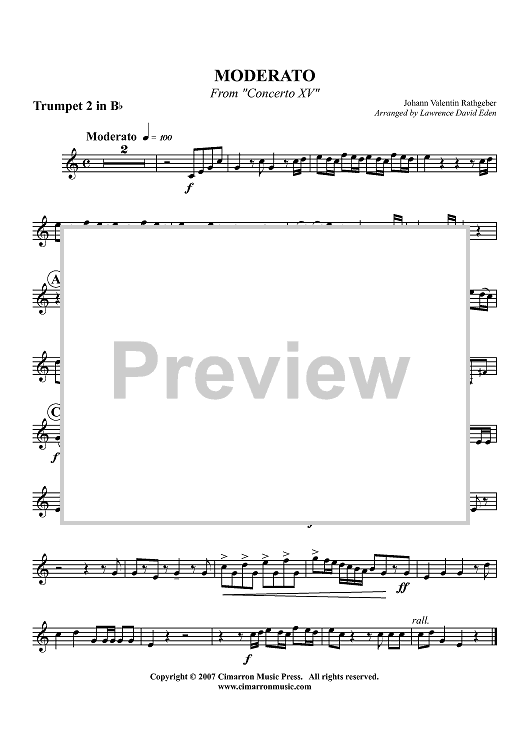 Digital Sheet Music for Moderato from Concerto XV - Trumpet 2 in Bb by Lawrence David Eden, Johann Valentin Rathgeber scored for Brass Quintet; id:413639