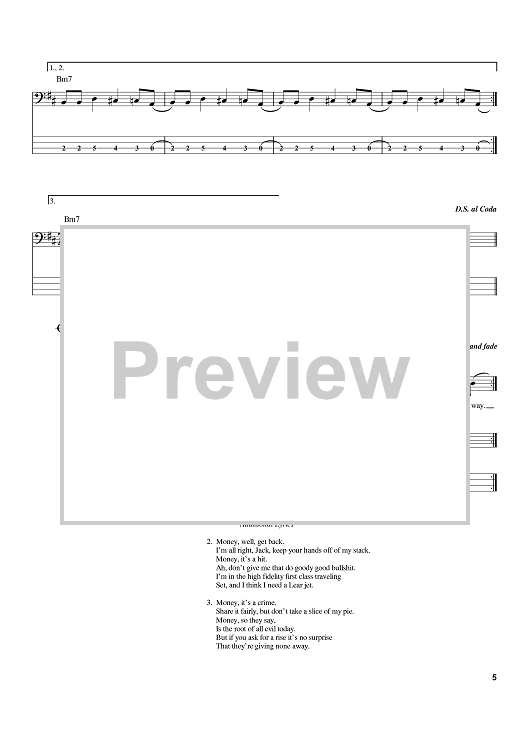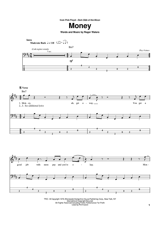 Digital Sheet Music for Money by Pink Floyd, Roger Waters scored for Bass Tab; id:384360