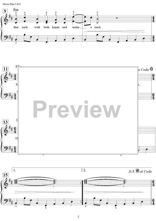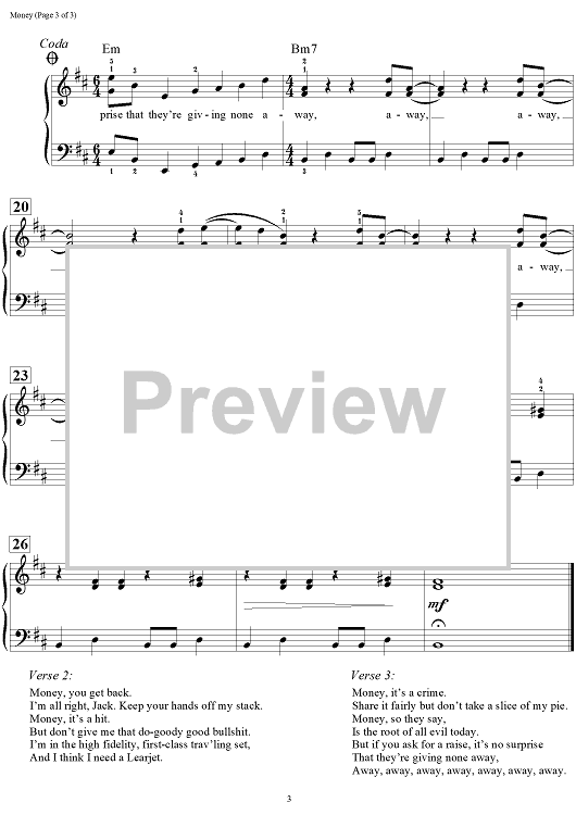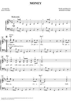 Digital Sheet Music for Money by Dan Coates, Pink Floyd, Roger Waters scored for Easy Piano/Vocal/Chords; id:454192