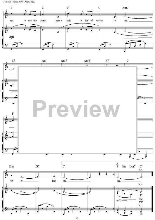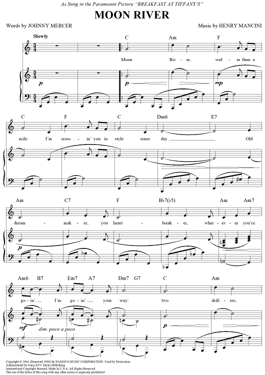 Digital Sheet Music for Moon River by Henry Mancini, Johnny Mercer, Andy Williams scored for Piano/Vocal/Chords; id:251544