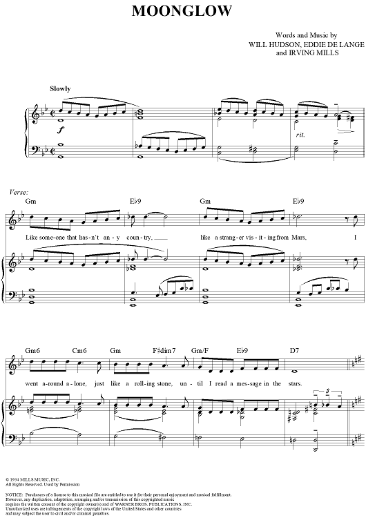 Digital Sheet Music for Moonglow by Irving Mills, Will Hudson, Eddie De Lange scored for Piano/Vocal/Chords; id:320658