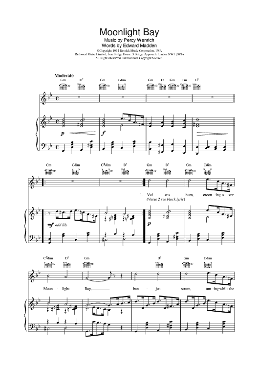 Digital Sheet Music for Moonlight Bay by Percy Wenrich scored for Piano/Vocal/Chords; id:379886