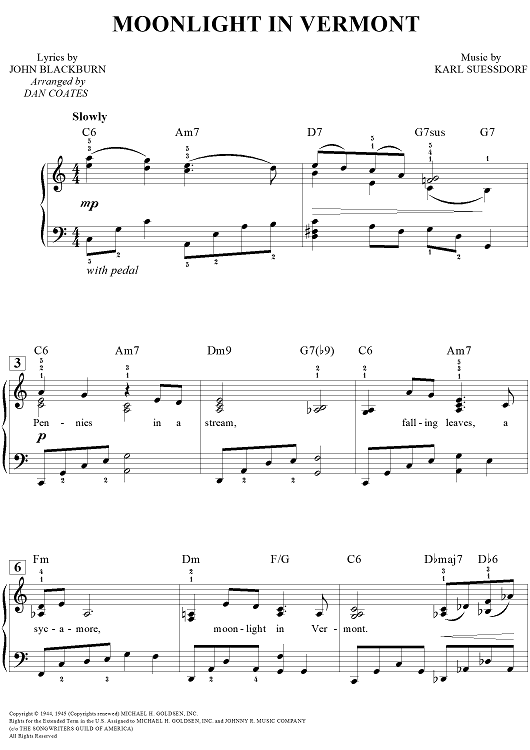 Digital Sheet Music for Moonlight in Vermont by Dan Coates, Karl Suessdorf, John Blackburn scored for Easy Piano/Vocal/Chords; id:457561