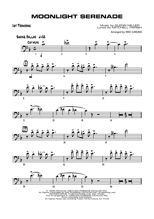 Digital Sheet Music for Moonlight Serenade - Trombone 1 by Mitchell Parish, Glenn Miller, Mike Carubia scored for Jazz Ensemble; id:358475