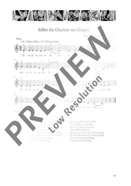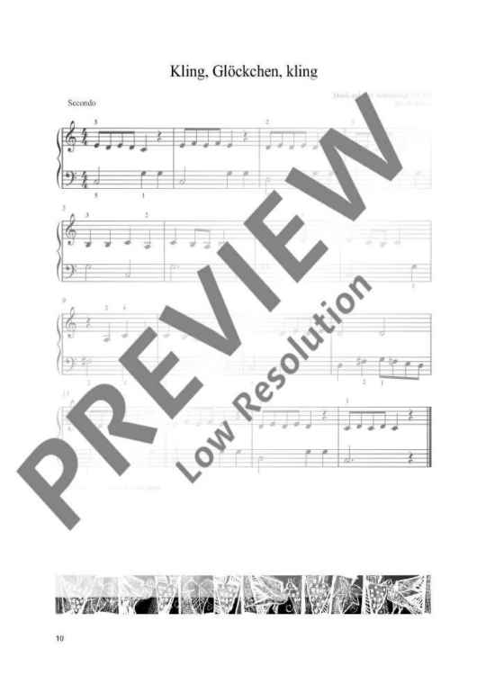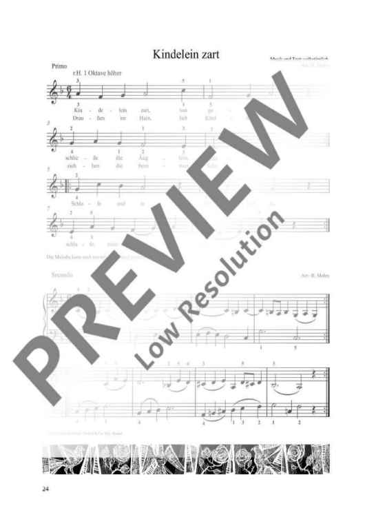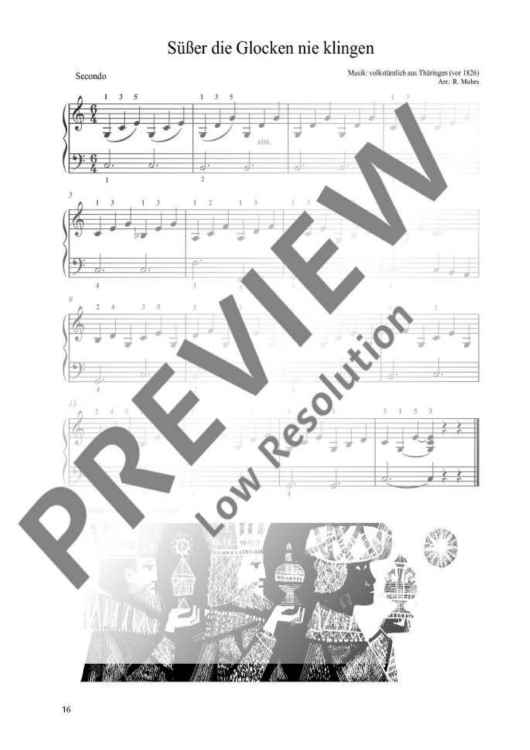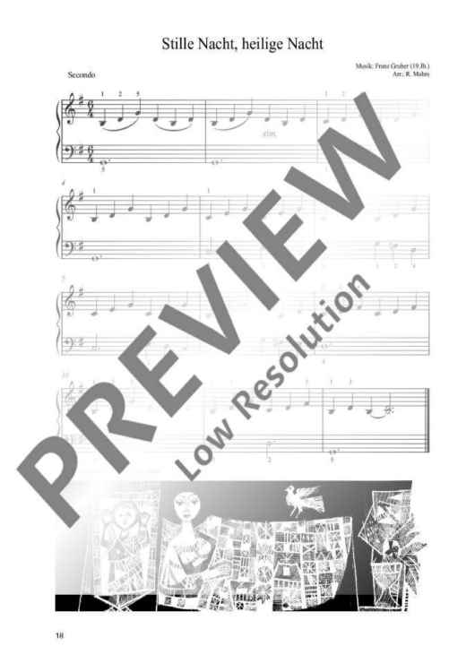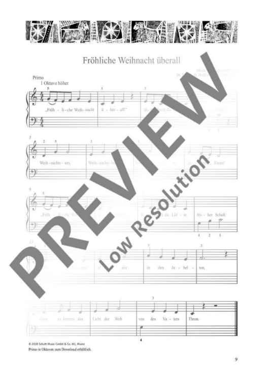The series Morgen kommt der Weihnachtsmann enables the playing of Christmas carols with several instruments and encourages making music together. All editions can be combined with each other. The new edition for piano duet is easy to play for both piano players and can be used in lessons after only a few weeks. For the primo player, some melodies are divided between the two hands, other songs can be played in octave intervals ('Diabelli principle') or have an easy second part. The secondo part, too, can be played easily by beginners. The volume is therefore also suitable for sight-reading, for lessons and for piano lovers.