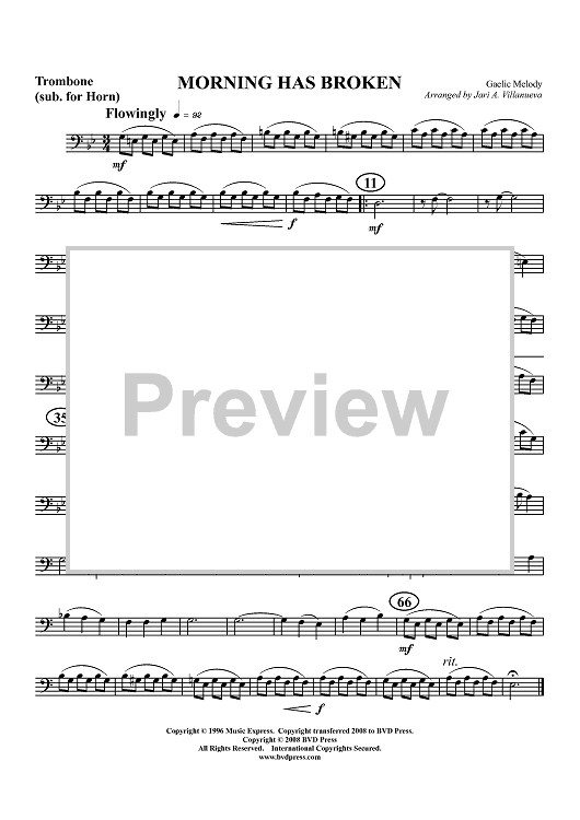 Digital Sheet Music for Morning Has Broken - Horn (Op. Trombone) by Traditional, Jari Villanueva scored for Brass Quartet; id:404984