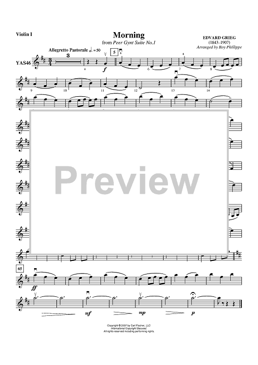 Digital Sheet Music for Morning - Violin 1 by Edvard Grieg, Roy Phillippe scored for Orchestra; id:408138