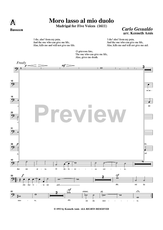 Digital Sheet Music for Moro lasso al mio duolo - Bassoon by , Carlo Gesualdo, Kenneth Amis scored for Woodwind Quintet; id:365523