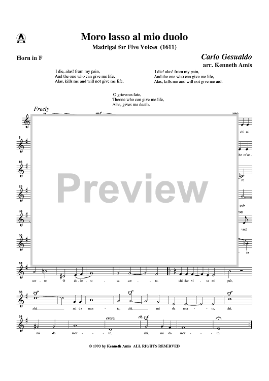 Digital Sheet Music for Moro lasso al mio duolo - Horn in F by , Carlo Gesualdo, Kenneth Amis scored for Woodwind Quintet; id:365522