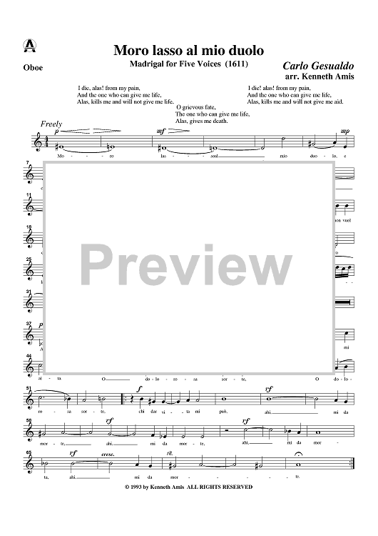 Digital Sheet Music for Moro lasso al mio duolo - Oboe by , Carlo Gesualdo, Kenneth Amis scored for Woodwind Quintet; id:365520
