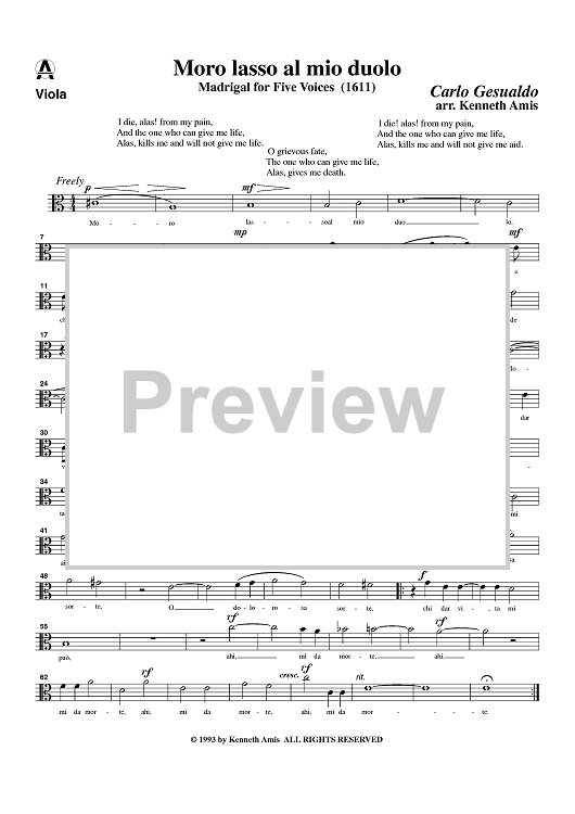 Digital Sheet Music for Moro lasso al mio duolo - Viola by , Carlo Gesualdo, Kenneth Amis scored for String Quintet; id:364559