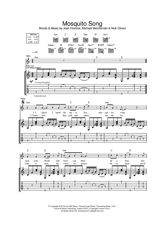 Digital Sheet Music for Mosquito Song by Michael Melchiondo, Josh Homme, Nick Oliveri, Queens of the Stone Age scored for Guitar Tab; id:383957