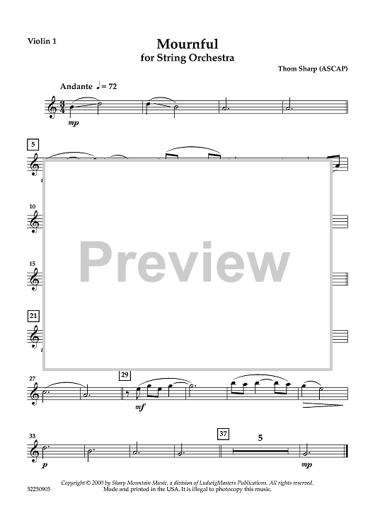 Digital Sheet Music for Mournful for String Orchestra - Violin 1 by , Thom Sharp scored for String Orchestra; id:460509
