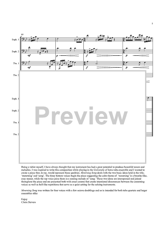 Digital Sheet Music for Mourning Song - Score by Claire Sievers scored for Tuba Quartet; id:410739