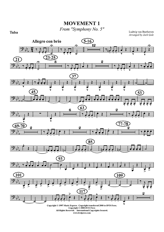 Digital Sheet Music for Movement 1 from "Symphony No. 5" - Tuba by Ludwig van Beethoven, Jack Gale scored for Brass Quintet; id:405034
