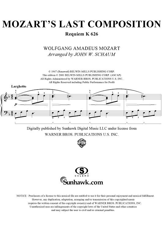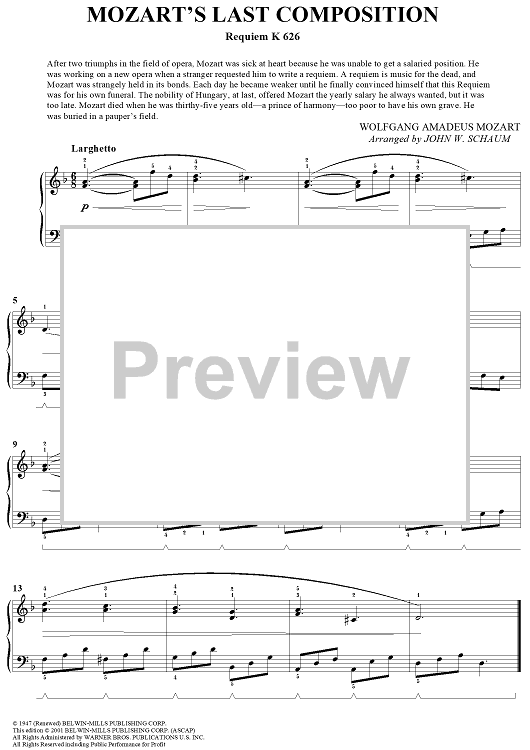 Digital Sheet Music for Mozart's Last Composition (Requiem K 626) by Wolfgang Amadeus Mozart, John W. Schaum scored for Piano Solo; id:293148