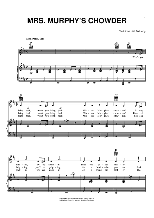 Digital Sheet Music for Mrs. Murphy's Chowder by scored for Piano/Vocal/Chords; id:373091