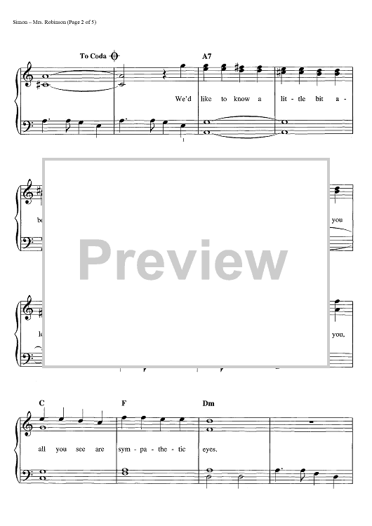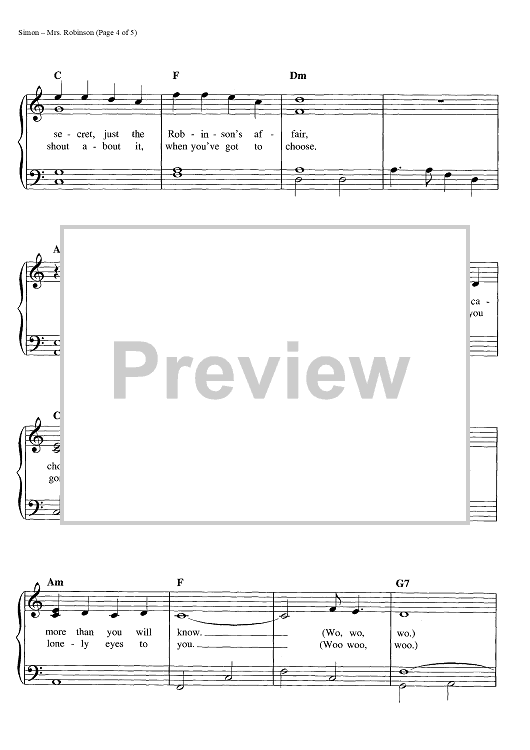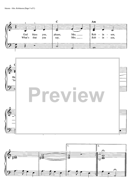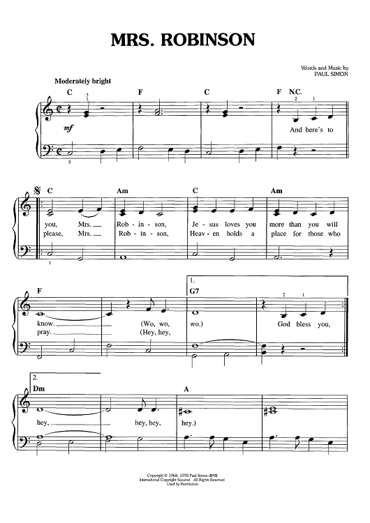 Digital Sheet Music for Mrs. Robinson by Paul Simon, Simon & Garfunkel scored for Easy Piano/Vocal/Chords; id:445030