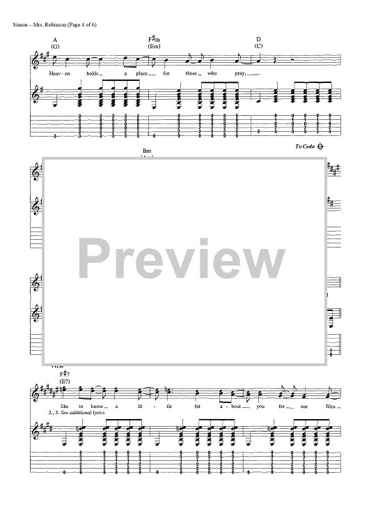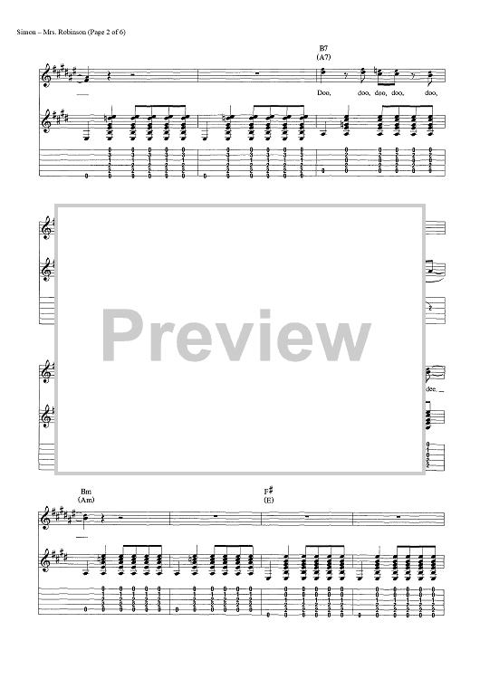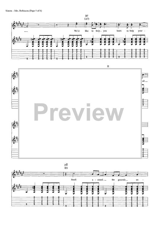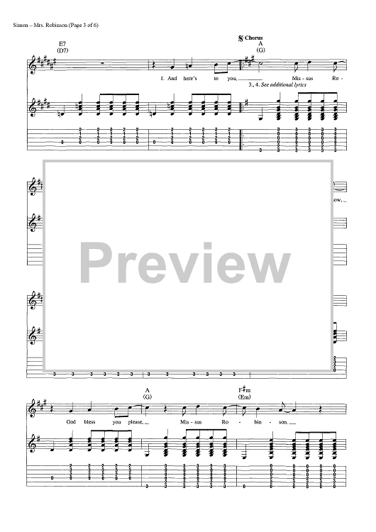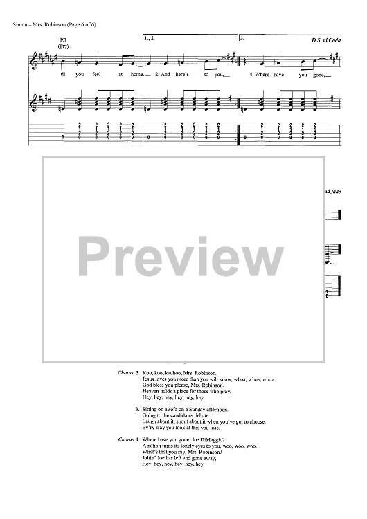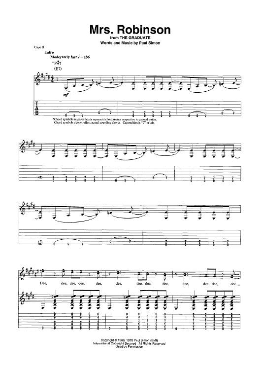 Digital Sheet Music for Mrs. Robinson by Paul Simon, Simon & Garfunkel scored for Guitar Tab/Vocal/Chords; id:454423